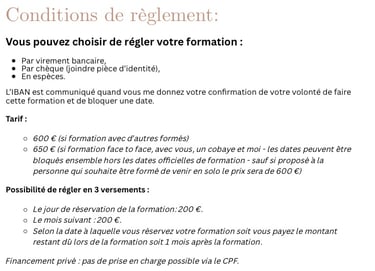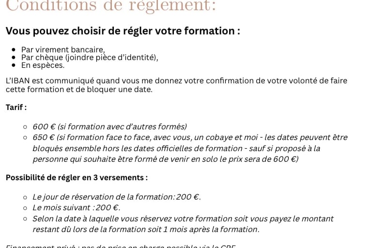 Il y a des dates que je fixe chaque année pour vous former à des dates précises mais nous pouvons également fixer des dates ensemble. Il est très important pour moi de partager ce protocole à un nombre réduit à la fois. Nous sommes alors maximum 4 personnes par formation.
