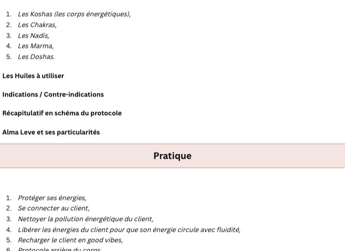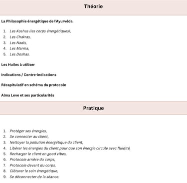 C'est un mélange d'énergétique et de massage ayurvédique. Ce qui est intéressant dans ce protocole c'est qu'il peut être pratiqué même avec un public n'étant pas ouvert à l'énergétique car il est composé d'une façon à effectuer le soin tout au long du Massage Ayurvédique.