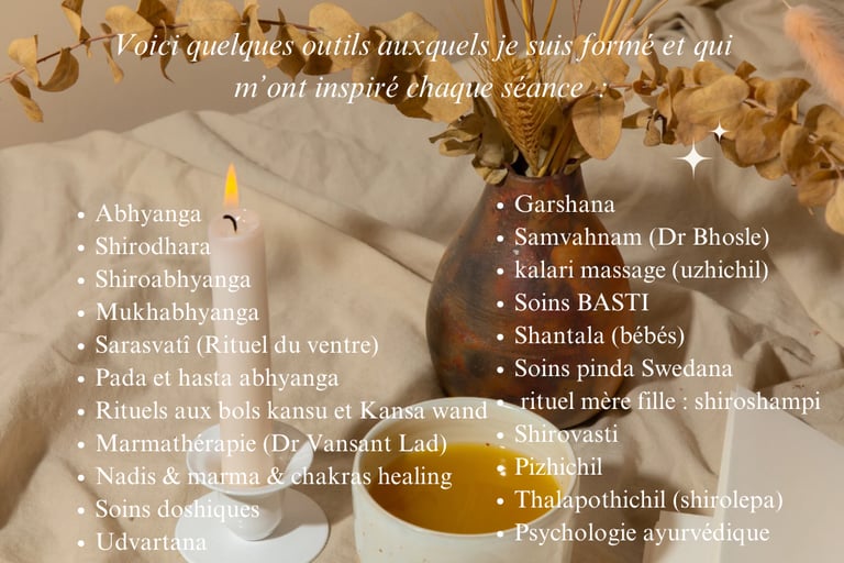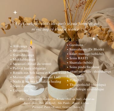 L'énergétique m'accompagne depuis petite et l'Ayurvéda je l'étudie et l'explore depuis plus de 15 années. C'est un chemin de tout une vie c'est une philosophie de vie qui englobe un savoir important qui doit être exploré, déconstruit parfois pour voir des changements dans ma vie, dans ma pratique et dans mes accompagnements au cabinet.